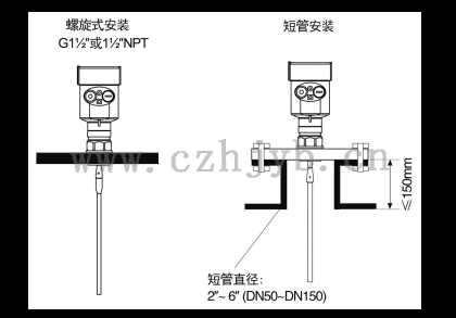 導(dǎo)波雷達(dá)物位計(jì)可采用螺紋連接,螺紋的長度不要超過15mm,還可以采用在短管上安裝。安裝短管直徑在2″至6″則安裝短管高度應(yīng)≤100mm(螺紋及短管的長度越短,測(cè)量越穩(wěn)定),若安裝短管較長,理想狀態(tài)應(yīng)將短管割短,或底部固定纜式探頭及選用絕緣對(duì)中支架以避免纜式探頭與短管末端接觸。