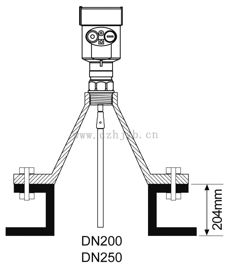 當(dāng)導(dǎo)波雷達(dá)需要安裝于直徑大于200mm短管時(shí),短管內(nèi)壁產(chǎn)生回波,在介質(zhì)介電常數(shù)低的情況下會(huì)引起測(cè)量誤差。因此,對(duì)于一個(gè)直徑為200mm或250mm的短管,需要選一個(gè)帶“喇叭接口”的特殊法蘭。
