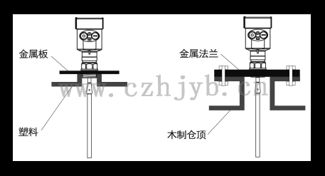 無論是纜式或桿式,若想導(dǎo)波雷達(dá)工作正常,過程連接表面應(yīng)為金屬。當(dāng)導(dǎo)波雷達(dá)裝在塑料罐上時(shí),若罐頂也是塑料或其它非導(dǎo)電材質(zhì)時(shí),儀表需要配金屬法蘭,若采用螺紋連接,需配一塊金屬板。
