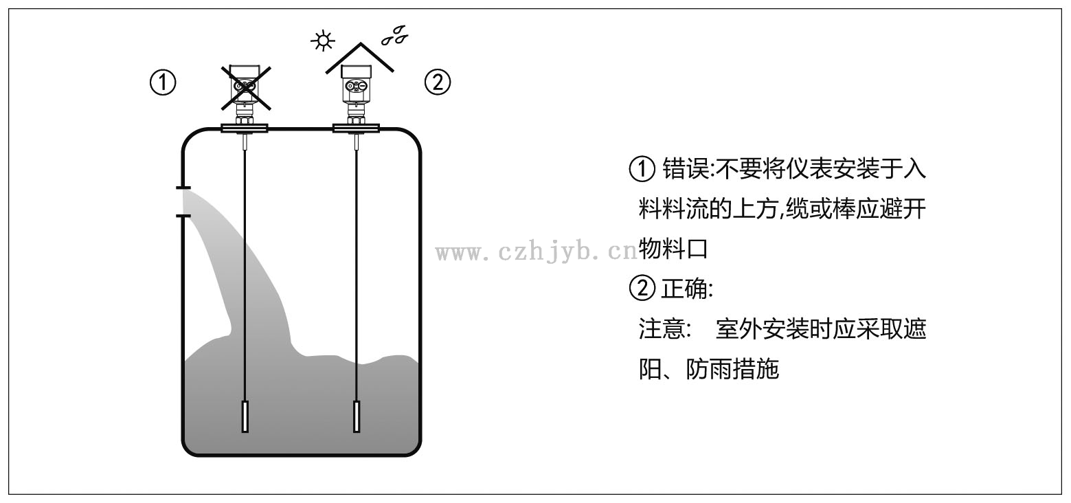下述的安裝指南適用于纜式和桿式測(cè)量固體粉料或液體。