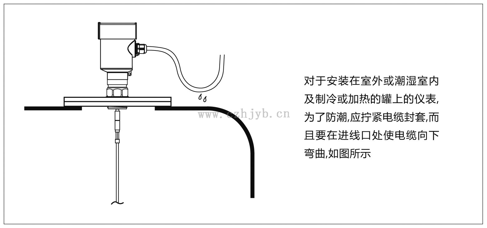 本儀表完全滿足防護(hù)等級(jí)IP66/67的要求,請(qǐng)確保電纜密封頭的防水性。如下圖: