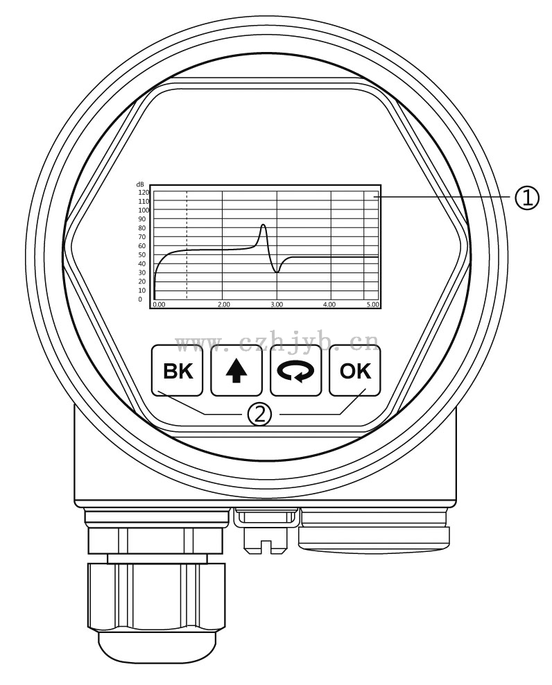 在進(jìn)入電氣接口前,將電纜向下彎曲,以確保水不會(huì)流入殼體,見①