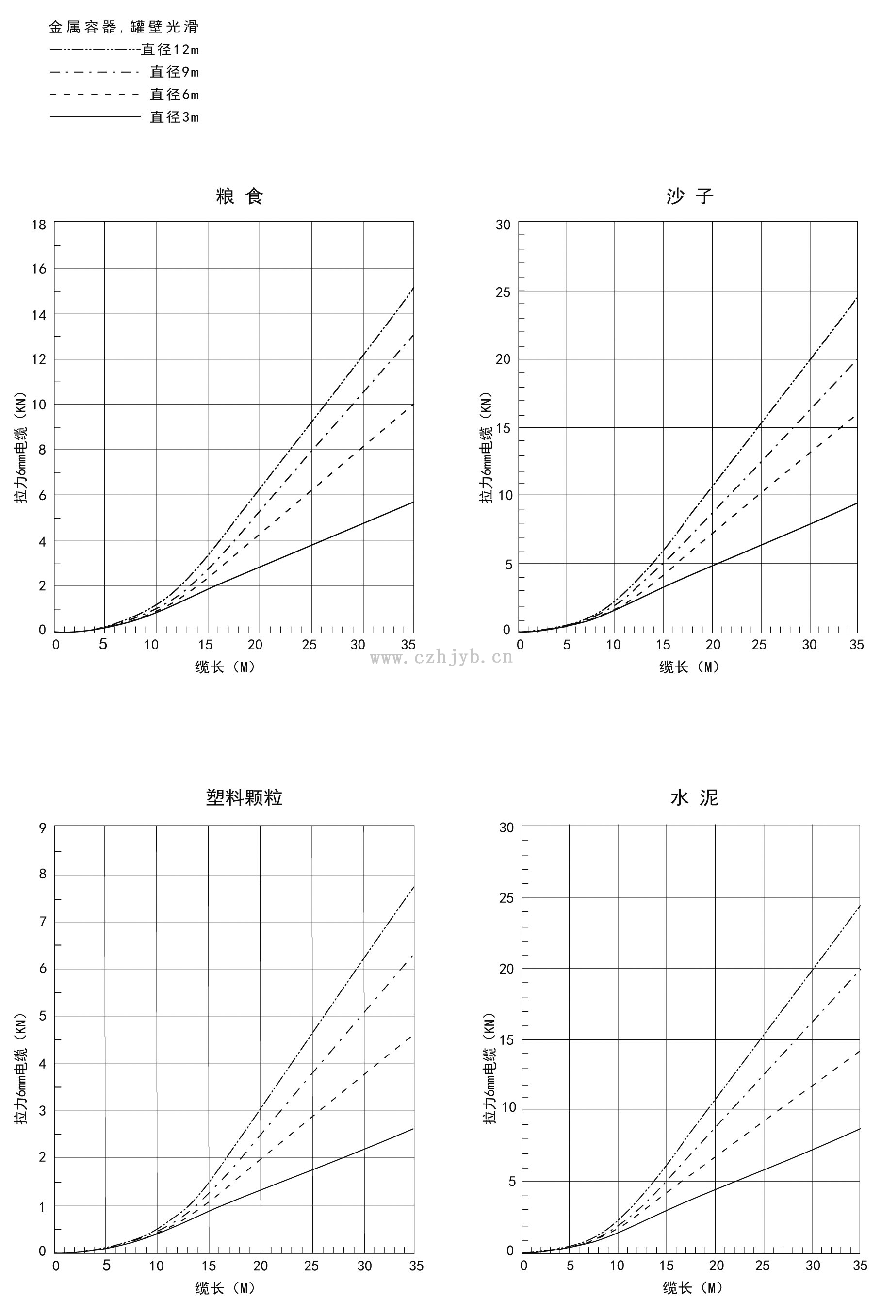 在測(cè)量固體介質(zhì)的時(shí)候,拉力取決于容器直徑和物位,以下顯示的是一些典型介質(zhì)產(chǎn)生的拉力。
