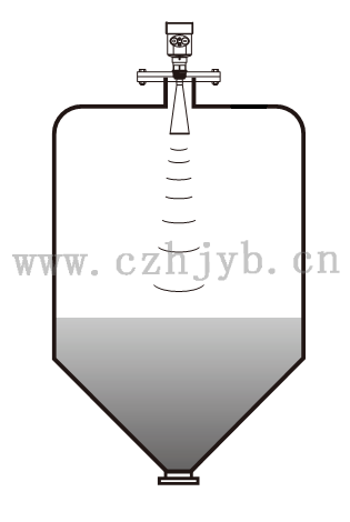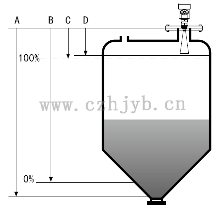 注:使用雷達物位計時,務必保證最高料位不能進入測量盲區(圖中D所示區域)。