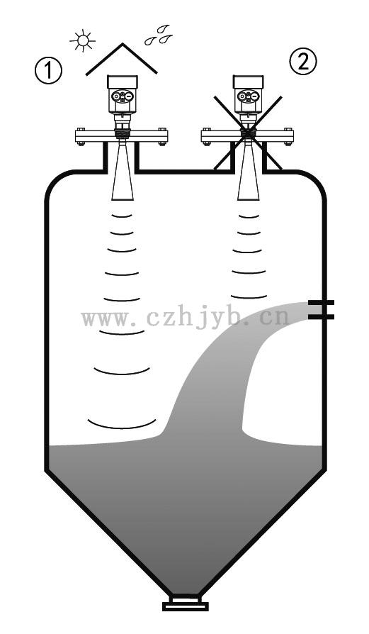 Ø 儀表不能安裝在拱形或圓形罐頂中間。除了會產生間接回波還會受到多次回波的影響。多次回波可能比真正回波的信號閥值還大,因為通過頂部可集中多個回波。所以不能安裝在中心位置。